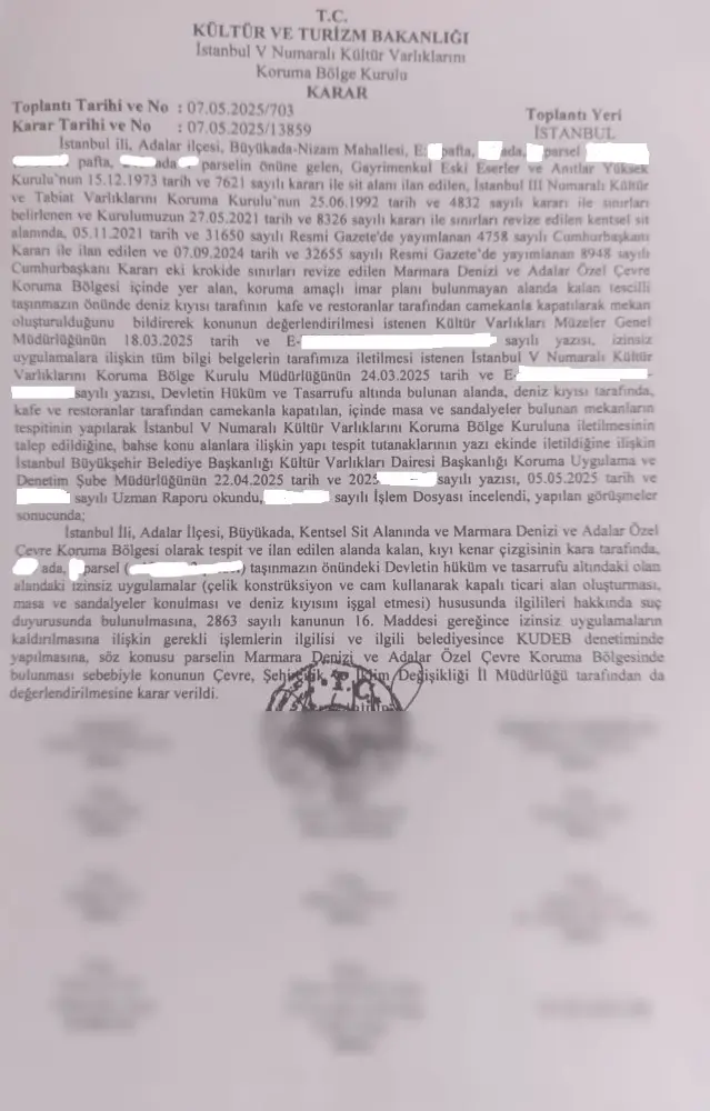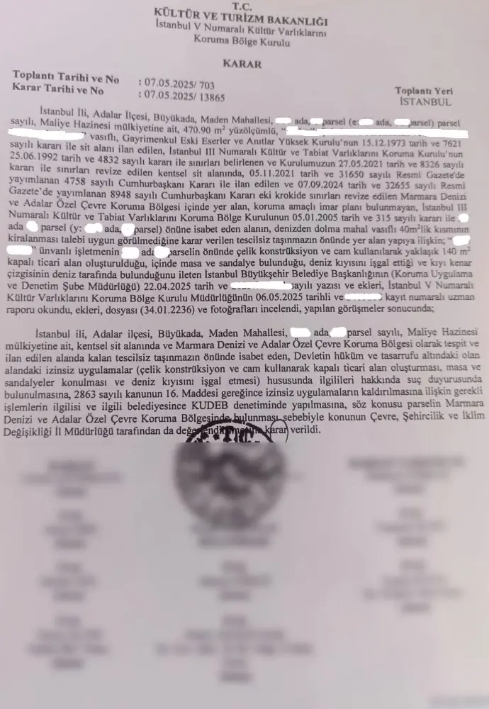 İstanbul’un incisi Adalar’da, Büyükada’daki kıyı işgalleriyle mücadelede önemli bir aşamaya gelindi. Kültür ve Turizm Bakanlığı’na bağlı İstanbul V Numaralı Kültür Varlıklarını Koruma Bölge Kurulu’nun 7 Mayıs 2025 tarihli kararlarıyla, kentsel sit alanı ve Marmara Denizi-Adalar Özel Çevre Koruma Bölgesi’nde yer alan çok sayıda kaçak yapının kaldırılmasına ve sorumlular hakkında yasal işlem başlatılmasına karar verildi.