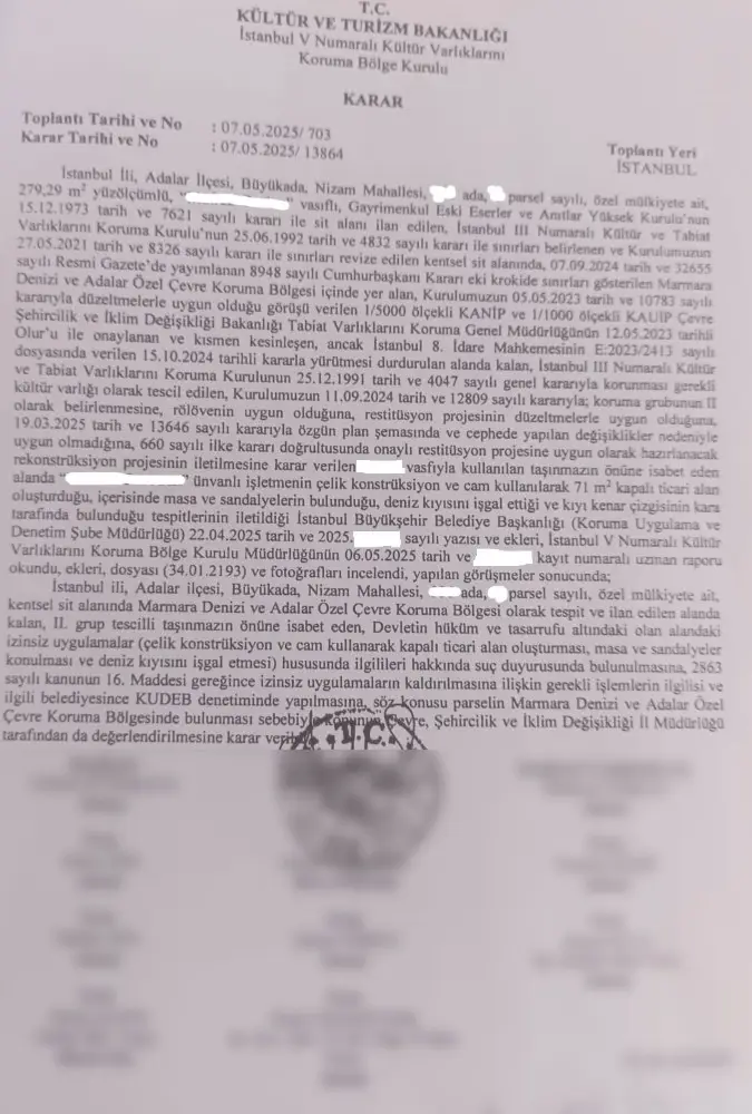 Büyükada’nın doğal ve kültürel mirasını tehdit eden izinsiz yapılaşmalar mercek altına alındı. Kurul’un aldığı kararlar doğrultusunda, özellikle “…… Restoran”, “…. …..” adlı işletmelerin ve … ada … parselin önündeki alanlarda tespit edilen mevzuata aykırı bütün uygulamaların yıkılması ve bu restoran hakkında suç duyurusunda bulunulması kararı alındı.